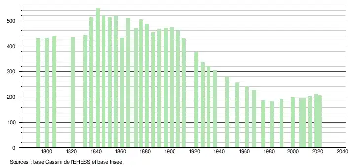 L'évolution du nombre d'habitants est connue à travers les recensements de la population effectués dans la commune depuis 1793. Pour les communes de moins de 10 000 habitants, une enquête de recensement portant sur toute la population est réalisée tous les cinq ans, les populations légales des années intermédiaires étant quant à elles estimées par interpolation ou extrapolation[27]. Pour la commune, le premier recensement exhaustif entrant dans le cadre du nouveau dispositif a été réalisé en 2008[28].