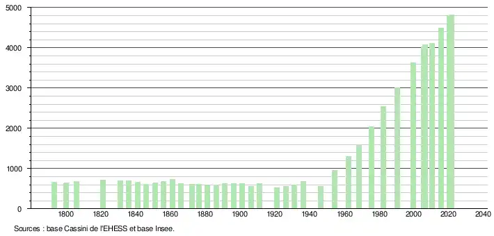 L'évolution du nombre d'habitants est connue à travers les recensements de la population effectués dans la commune depuis 1793. Pour les communes de moins de 10 000 habitants, une enquête de recensement portant sur toute la population est réalisée tous les cinq ans, les populations légales des années intermédiaires étant quant à elles estimées par interpolation ou extrapolation[21]. Pour la commune, le premier recensement exhaustif entrant dans le cadre du nouveau dispositif a été réalisé en 2005[22].