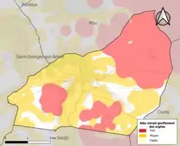 La commune est vulnérable au risque de mouvements de terrains constitué principalement du retrait-gonflement des sols argileux[19]. Cet aléa est susceptible d'engendrer des dommages importants aux bâtiments en cas d’alternance de périodes de sécheresse et de pluie. 85,9 % de la superficie communale est en aléa moyen ou fort (90 % au niveau départemental et 48,5 % au niveau national). Sur les 591 bâtiments dénombrés sur la commune en 2019, 431 sont en aléa moyen ou fort, soit 73 %, à comparer aux 83 % au niveau départemental et 54 % au niveau national. Une cartographie de l'exposition du territoire national au retrait gonflement des sols argileux est disponible sur le site du BRGM[20],[Carte 2].