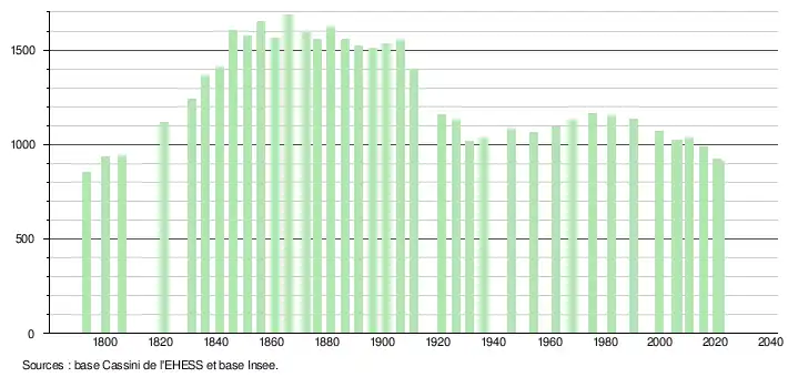 En 2021, la commune comptait 912 habitants[Note 3], en diminution de 7,41 % par rapport à 2015 (Cher : −3,05 %, France hors Mayotte : +1,84 %).