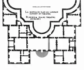 Un plan en est donné dans le livre de Jacques Androuet du Cerceau, Les plus excellents bastiments de France sous le titre La moitié du plan du commencement du théâtre. Les gravures d'Androuet du Cerceau doivent être interprétées car elles doivent mélanger le projet et la réalité. Une vue en plan générale montrant les deux châteaux de Saint-Germain-en-Laye donne le plan du Château-Neuf : un corps de bâtiment allongé en rez-de-chaussée cantonné de quatre pavillons où se trouvaient les appartements du roi et de la reine avec chambre et garde-robe dont le toit prévoit des combles habitables et un appartement des bains avec « estuves, baigneries et cabinet pour les dites estuves ». Le corps de bâtiment allongé comprenait une salle une chapelle et une antichambre. Devant la maison il y a une grande cour « en carré en forme d'un téatre, en laquelle y aura quatre grands demys ronds à l'endroict des quatre pans carrez d'icelle en saillie hors la quadrature desd. pans carrés ». La cour s'ouvrait vers le Château-Vieux. Par rapport à la description du marché, le plan d'Androuet du Cerceau montre un double mur entourant la cour qui a été interprété comme étant une galerie. Sur une vue cavalière dessinée par Androuet du Cerceau et conservée au British museum montre deux ailes de part et d'autre de la maison, à l'est, dominant une terrasse à laquelle on accède par un escalier.