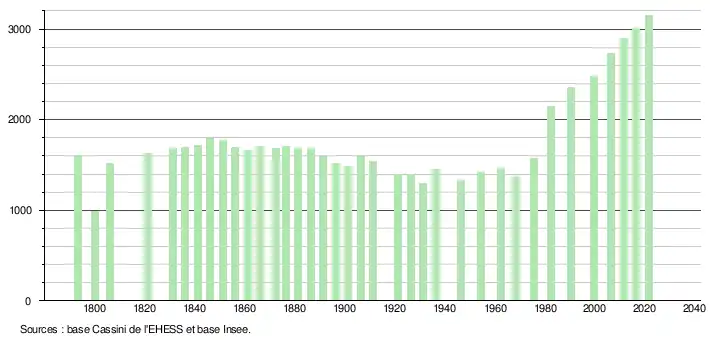 L'évolution du nombre d'habitants est connue à travers les recensements de la population effectués dans la commune depuis 1793. Pour les communes de moins de 10 000 habitants, une enquête de recensement portant sur toute la population est réalisée tous les cinq ans, les populations légales des années intermédiaires étant quant à elles estimées par interpolation ou extrapolation[19]. Pour la commune, le premier recensement exhaustif entrant dans le cadre du nouveau dispositif a été réalisé en 2006[20].