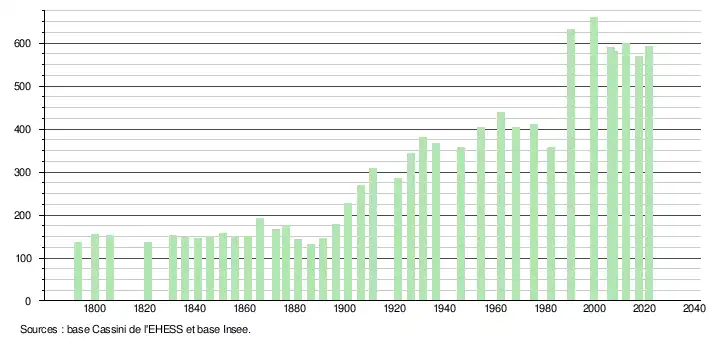 L'évolution du nombre d'habitants est connue à travers les recensements de la population effectués dans la commune depuis 1793. Pour les communes de moins de 10 000 habitants, une enquête de recensement portant sur toute la population est réalisée tous les cinq ans, les populations légales des années intermédiaires étant quant à elles estimées par interpolation ou extrapolation[29]. Pour la commune, le premier recensement exhaustif entrant dans le cadre du nouveau dispositif a été réalisé en 2007[30].