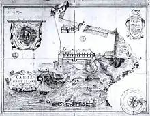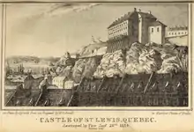 - En 1636, ces deux forts sont détruits Charles Jacques Huault de Montmagny fait construire un fort et un château (bâtiment d'un seul étage qui sera agrandi au début des années 1680). En 1643, le gouverneur Louis d'Ailleboust de Coulonge, fait construire quatre bastions et fait remplacer la palissade de bois de 1642, par un épais mur de pierres[6]. Frontenac dote l'ensemble de 17 canons situés au sud du site en 1690. Il multiplie par quatre la surface du fort Saint Louis, et il l'organise selon le principe d'ouvrage bastionné à la Vauban. La configuration du fort ne changera plus[5].