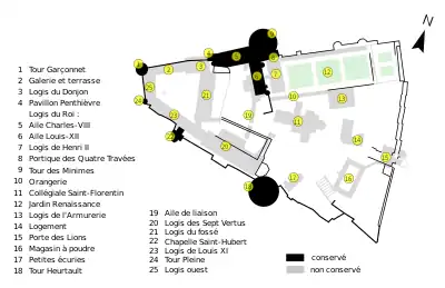 Il a été partiellement détruit après la Révolution[1]. Du projet de Charles VIII subsistent toutefois le logis royal, la chapelle Saint-Hubert où reposent les restes présumés de Léonard de Vinci[2], les terrasses et les tours cavalières qui donnent au monument cette silhouette si singulière.