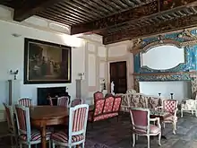 Dans le plus vaste de ces salons, les poutres du plafond sont peintes de divinités antiques et de paysages, parmi lesquels une représentation du château lui-même, tel qu’il était à l’époque. La cheminée, en pierre incrustée de marbre, est ornée de sirènes, de bacchantes, de monstres marins et d’une renommée ailée soufflant dans sa trompe au sommet. Dans le trumeau, une représentation de Suzanne et les Vieillards, attribuée à Le Brun, s’est presque effacée avec le temps.