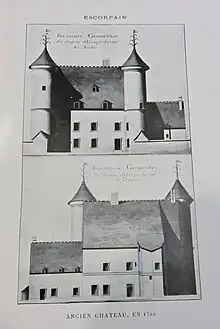 Même si Escorpain et les Authieux relèvent au XIIe siècle des seigneurs de la baronnie de Châteauneuf, Hugues III et son fils Gervais[1], ces deux hameaux sont pris en étau entre le duché de Normandie et le royaume de France. L’Avre en est la ligne frontalière. Ainsi, le bourg de Nonancourt, sur la rive nord, fait partie du duché de Normandie et a été fortifié en 1112 par Henri 1er Beauclerc. Le logis seigneurial d’Escorpain a sans nul doute une vocation défensive. Le premier seigneur attesté au début du XVIe siècle est Jacques de Beaumestre[2] suivi par plusieurs générations de la famille de Vieuxpont[3]. D’abord Jehan, gouverneur de Dreux en 1591, démis de ses fonctions pour avoir été absent de Dreux pendant le siège remporté par Henri IV. Puis Pierre, capitaine de chevau-légers, à l’origine de la construction du nouveau château, avec le concours de son frère Guillaume, chevalier de Malte. La preuve en serait les deux croix de Malte sur les murs de l’édifice. La terre est érigée en châtellenie avant sa mort le 19 décembre 1630. Son fils Jean III, gouverneur royal du fort de Pierre-Châtel sur le Rhône en 1625 et capitaine d’une compagnie de gens à pied, lui succède. Sa mère vient de temps en temps à Escorpain et y rencontre le poète Rotrou, gouverneur de Dreux[4]. Le domaine passe à son décès en 1641 à son fils Bernard-François puis à la sœur aînée de ce dernier, Charlotte, enfin à Louise qui regrette d'avoir confié la garde du château à des domestiques, Guillaume et Jeanne Robes, dont elle dénonce les agissements en 1662. Ils se sont prévalus de son absence pour vendre blés, avoines, foins et bois et recevoir ce qui lui était dû, en plus de faire mourir des bestiaux[5]. Le reste de la famille vit au château : ses sœurs Catherine et Renée, le mari de Renée, Charles d’Ailly, baron d’Annery et maréchal de camp. Charles d’Ailly est le fils de Charles d’Ailly II et de Geneviève Testu de Balincourt, fille du seigneur d’Ecorpain en Maine. Le château est mis sous séquestre en septembre 1658 lorsque Charles d’Ailly prend la tête de la révolte nobiliaire des gentilshommes de l’Orléanais contre la politique du cardinal Mazarin[6]. Il est restitué à son fils Jacques qui le met en vente vers 1699.