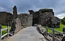Vue depuis la motte castrale montrant l'emplacement du pont-levis et les restes de la porterie sur la droite.