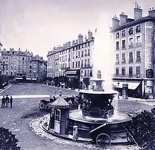 Sa construction est en effet le fruit du travail de plusieurs grands artistes dont Madona qui a dessiné les vasques, Nadon qui les a sculptées, et Victor Sappey, sculpteur grenoblois qui a sculpté les angelots et les dauphins. Entièrement réalisée en pierre de Sassenage et en bronze, cette fontaine possède un puissant jet d’eau qui pouvait atteindre vingt-deux mètres de hauteur[2].