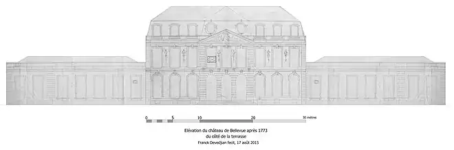 De taille relativement modeste, Bellevue fait davantage penser à la maison d'un riche particulier qu'à un château royal. De fait, il a été conçu à l'origine non pas pour le Roi lui-même mais pour la marquise de Pompadour, qui souhaitait y recevoir Louis XV dans l'intimité.