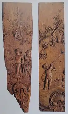 « Six dessus de porte de M. Oudry, représentant les attributs de la chasse & de la pêche, ornent la salle à manger, & ces mêmes attributs sont exécutés en menuiserie, avec la plus grande délicatesse, par M. Verbek. » (Piganiol, 1760).