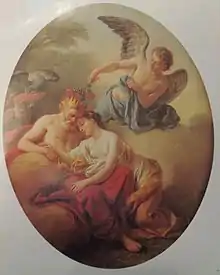 On traverse en retour une galerie étroite, qui n'a de remarquable qu'une très-jolie figure de marbre, qui représente l'Amour ; elle est de M. Sally. Cette galerie conduit à la pièce destinée d'abord à être une salle de musique, & qui est devenue aujourd'hui la salle à manger des Seigneurs : on y admire deux dessus de porte de M. Pierre.