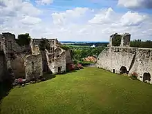 Enfin, la cour du château (comme celle de la basse-cour) devait abriter une série de bâtiments et logis dont les seules traces visibles se lisent encore sur la face interne des courtines (cheminées, etc.). Des fouilles archéologiques ont d'ailleurs révélées différents types d'occupation et aménagement tout au long des siècles. Effectivement, outre son statut de forteresse quasi imprenable, le castrum était aussi un lieu de vie servant de résidence. Ainsi était accolé au mur sud des écuries et diverses constructions au mur nord[4]. Une chapelle, dont il ne reste aujourd’hui que les ruines, se trouvait accolée à la tour sud du châtelet d'entrée. Quelques traces de motifs peints encore visibles laissent penser que sa voute devait être peinte[4].