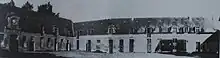 Ledit chasteau est comme nous avons dict en forme carrée, orné de beaux pavillons aux quatre coings. Il ne loge personne au premier bastiment, qui est de moindre haulteur que le reste du corps de logis, et ne sert que de parade pour parfaire la forme carrée. Ce qui s'y remarque de beau, c'est qu'il esleve une seconde terrasse bordée de piliers, crainte de pouvoir cheoir, et toute pavée de tables de pierre de taille, à laquelle on monte par deux divers escaliers qui sont aux deux extrémitez, et dont on a une fort belle veue. Du costé droict de ladicte terrasse en entrant dans un des pavillons est le logement du concierge qu'il faut demander pour pouvoir entrer dans les chambres, et de l'autre costé gauche est une fort belle chapelle toute dorée au dedans, et azurée, autour de laquelle sont représentées à la perfection les vies de Nostre Seigneur, et de la Vierge, d'excellente peinture. La cour est fort grande, et garnie de quelques petites pièces de campagne, outre quelques autres qui sont sur les fossez.