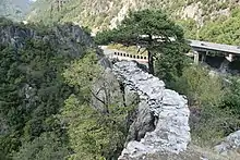 En 1884, on pouvait voir les ruines de deux bâtiments situés à la base de l'escalier, celles des soubassements de trois murs et d'une tour érigée sur les bords de la rivière, sur la rive gauche, et qui devait défendre le pont, un peu en aval du pont actuel[13],[3],[14]. L'architecte Borrel relève qu'une tour devait très probablement se trouver également sur la rive droite[3]. Ces deux tours pouvaient servir, pour l'architecte Borrel, de corps de garde ainsi que bureau de péage[14]. Il indique par ailleurs que ce pont pouvait être « construit en charpente »[14].