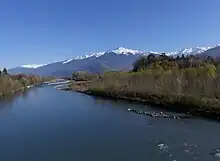 Vue de la confluence de l'Arc et de l'Isère depuis le pont Royal avec la colline où se dresse le château de Chamousset sur la droite ; au fond, le massif de la Lauzière.