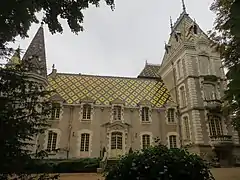 Le château avec sa toiture traditionnelle en tuile vernissée de Bourgogne à Aloxe-Corton. | ||||