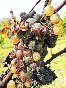 Habituellement considéré comme un ennemi des vignerons, il est responsable de la magie des vins de Sauternes. En automne, sous l'effet d'un microclimat particulier, fait d'humidité, de soleil et de vent, quand il apparaît sous sa forme la plus appréciable, il consomme une partie des sucres et acides présents dans le raisin. Progressivement, le raisin se concentre par évaporation, augmentant sa densité en arômes et en sucres (jusqu'à 20-21 degrés d'alcool potentiel, soit 350 grammes de sucre par litre) La baie se brunit, se dessèche. Le raisin se « botrytise ». Mais la transformation du raisin en « pourriture noble » par le botrytis implique un important sacrifice. Il n'est pas rare de sacrifier la moitié de la récolte, atteinte par la mauvaise pourriture.