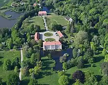 Les bâtiments de ferme et des communs sont construits dans un axe nord-sud à côté du château. On remarque un bâtiment surmonté d'une tour construit en 1743 et restauré en 2008-2009. Le château est entouré depuis 1841 d'un parc à l'anglaise.