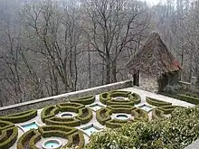 Les jardins sont arrangés en 12 terrasses[2] aux alentours du château. Il y a notamment le Taras Wodny (terrasse d'eau), le Taras Bogini Flory (terrasse de Flore), le Taras Kasztanowcowy (terrasse des châtaigniers), le Taras Środkowy (terrasse du milieu), le Taras Różany (Kaskadowy) (terrasse des roses, ou des cascades) et le Taras Podkowiasty (terrasse en fer à cheval).