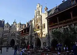 Inspiré entre autres des châteaux de Hohenzollern, Stolzenfels et Sooneck, il est construit entre 1858 et 1867, par les architectes Conrad Wilhelm Hase, Edwin Oppler (en), et Ferdinand Schorbach (de), avec pont-levis, haut donjon, chapelle, 130 chambres sur cinq étages, parc romantique, jardin à l'anglaise, au cœur d'un vaste domaine forestier. Il est richement décoré et meublé en style néo-gothique par les architectes d’intérieur Justus Heinrich Jakob Molthan (de) et Hermann Narten (de), et par le peintre Otto Knille...