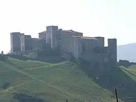 De plus, le château est ceinturé par des parois, qui regroupent dix tours[15]. Le mur d’enceinte est composé de briques de forme rectangulaire, dont la mesure est de 4,5-5 × 15 × 29-30 cm[16]. Les tours sont de deux formes différentes, dont trois tours sont de forme pentagonale et sept tours sont de formes rectangulaires. D’ailleurs, il est pertinent de mentionner l’extraordinaire solidité de ce château médiéval, car elle a résisté à de nombreux tremblements de terre au cours de son histoire.