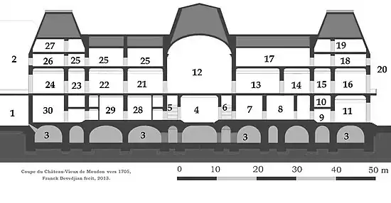 Coupe du Château-Vieux de Meudon, avec la chapelle, état après 1702. Axe Est-Ouest, 2013.