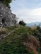 Un petit sentier balisé longeant la voie du funiculaire et le ruisseau de Montfort mène au château depuis le village [6].