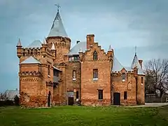 Le château s'élève au sommet d'une haute colline. Un haut mur de pierre le fait ressembler à une forteresse médiévale. Le château est composé d'un ensemble de trois bâtiments, des écuries et une tour faisant office d'observatoire astronomique avec un télescope. L'architecture du complexe est formée de plusieurs styles. Le manège et l'écurie sont dans un style de Renaissance italienne du nord tandis que l'aile ouest parfois appelée «Château anglais» est dans un style néo-gothique avec un toit présentant plusieurs niveaux[2]. Les ailes nord et est sont symétriques et sont construites dans un style néo-mauresque avec des éléments néo-gothiques[2]. Le palais lui-même, bâti avec des briques rouges et jaunes mélangeait les styles néo-mauresques et néo-gothiques aussi[2].