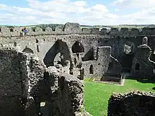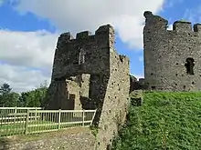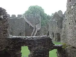 Les bâtiments domestiques à l'intérieur du mur comprennent une cuisine, un hall, un solarium, des chambres d'hôtes et une ancienne chapelle[3]. L'eau d'une source naturelle est acheminée sous pression vers les bâtiments du château[4]. Une tour-porte carrée, en grande partie en ruine, garde l'entrée du château intérieur et constitue peut-être la première partie du château d'origine à avoir été partiellement construite en pierre[3]. Du côté opposé, une tour carrée dépassant du mur contient la chapelle[3], on pense qu'il s'agit d'un ajout du XIIIe siècle. Elle semble avoir été convertie en emplacement de canon pendant la guerre civile anglaise. Un ancien mur extérieur de cour, apparemment construit en bois avec des défenses en terre, a depuis été détruit, ne laissant aucune trace[5] . Il existe également des références historiques à un donjon, également aujourd'hui disparu[6].