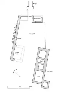 Au sud de ce mur se trouve le mur restant du donjon. Le monticule en contrebas est formé par les éboulis des trois autres murs. La ruine suggère que le donjon faisait approximativement 16 mètres et 12 avec des murs de 2,9 mètres d'épaisseur s'élevant jusqu'à un parapet pourvu de mâchicoulis[9].