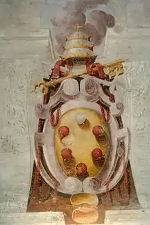 Deux grandes armoiries de l'empereur Rodolphe II de Habsbourg et du pape Grégoire XIII sont peintes sur les côtés de la fenêtre du mur opposé, symbolisant respectivement le pouvoir temporel et spirituel[3]. Enfin, la pièce conserve une cheminée du XVIe siècle, sur le manteau de laquelle est peint un paysage[31].