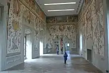 Les lunettes de la voûte et des murs sont décorées de grotesques ; parmi les nombreuses figures représentées, on peut voir des scènes très ironiques, dont un garçon monté sur un bélier et un petit théâtre avec un musicien ambulant et un nain barbu[3]. Sur les côtés du portail du mur sud, deux grandes cartes géographiques des régions italiennes sont représentées au centre de grands panneaux[35].