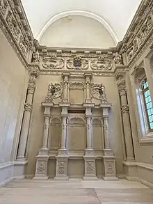 Au-dessus de cette loggia se trouve un portrait de François Ier portant le grand collier de l’Ordre de Saint-Michel. De longues et étroites fenêtres géminées, couronnées de coquilles soutenues par des putti, complètent l’architecture de cette façade de pur style Renaissance.
