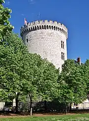 Construite dans la seconde moitié du XIVe siècle, de forme polygonale, en saillie sur la courtine nord, elle se compose d'une chambre basse garnie d'une double canonnière, de la première moitié du XVe siècle[13], aujourd'hui inaccessible car murée en 1726, légèrement voutée qu'éclaire une fenêtre grillagée et au-dessus la « salle haute », voûté avec de belles nervures, qui a contenu les archives des ducs avant que le trésorier général de Savoie en fasse ses bureaux en 1726. Au-dessus, une petite pièce qui s'éclaire, sur ses six pans, par une baie présentant un large ébrasement et la terrasse, ceinte d'un parapet percé de sept archères cruciformes.
