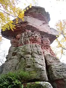 Un rocher gréseux en forme de champignon se situe devant les ruines de l'ancien château fort.