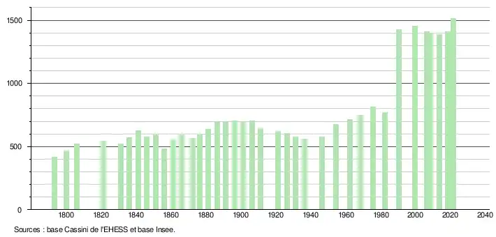 L'évolution du nombre d'habitants est connue à travers les recensements de la population effectués dans la commune depuis 1793. Pour les communes de moins de 10 000 habitants, une enquête de recensement portant sur toute la population est réalisée tous les cinq ans, les populations légales des années intermédiaires étant quant à elles estimées par interpolation ou extrapolation[20]. Pour la commune, le premier recensement exhaustif entrant dans le cadre du nouveau dispositif a été réalisé en 2008[21].