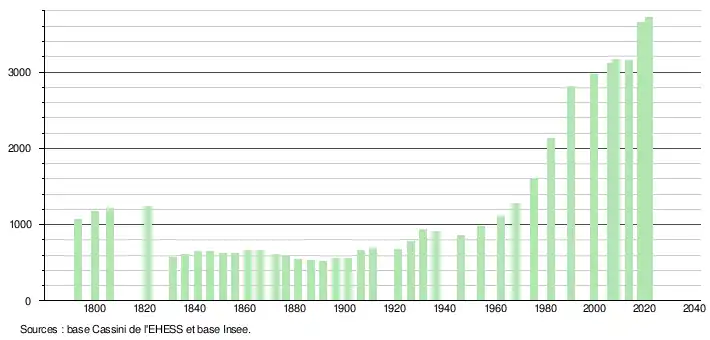 L'évolution du nombre d'habitants est connue à travers les recensements de la population effectués dans la commune depuis 1793. Pour les communes de moins de 10 000 habitants, une enquête de recensement portant sur toute la population est réalisée tous les cinq ans, les populations légales des années intermédiaires étant quant à elles estimées par interpolation ou extrapolation[19]. Pour la commune, le premier recensement exhaustif entrant dans le cadre du nouveau dispositif a été réalisé en 2008[20].