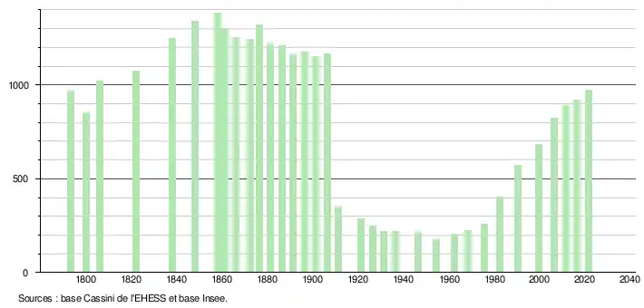 L'évolution du nombre d'habitants est connue à travers les recensements de la population effectués dans la commune depuis 1793. Pour les communes de moins de 10 000 habitants, une enquête de recensement portant sur toute la population est réalisée tous les cinq ans, les populations légales des années intermédiaires étant quant à elles estimées par interpolation ou extrapolation[20]. Pour la commune, le premier recensement exhaustif entrant dans le cadre du nouveau dispositif a été réalisé en 2006[21].