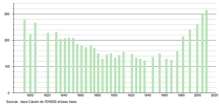 L'évolution du nombre d'habitants est connue à travers les recensements de la population effectués dans la commune depuis 1793. À partir du , les populations légales des communes sont publiées annuellement dans le cadre d'un recensement qui repose désormais sur une collecte d'information annuelle, concernant successivement tous les territoires communaux au cours d'une période de cinq ans. Pour les communes de moins de 10 000 habitants, une enquête de recensement portant sur toute la population est réalisée tous les cinq ans, les populations légales des années intermédiaires étant quant à elles estimées par interpolation ou extrapolation[5]. Pour la commune, le premier recensement exhaustif entrant dans le cadre du nouveau dispositif a été réalisé en 2005[6],[Note 1].