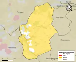 La commune est vulnérable au risque de mouvements de terrains constitué principalement du retrait-gonflement des sols argileux[16]. Cet aléa est susceptible d'engendrer des dommages importants aux bâtiments en cas d’alternance de périodes de sécheresse et de pluie. 92,9 % de la superficie communale est en aléa moyen ou fort (90 % au niveau départemental et 48,5 % au niveau national). Sur les 937 bâtiments dénombrés sur la commune en 2019, 847 sont en aléa moyen ou fort, soit 90 %, à comparer aux 83 % au niveau départemental et 54 % au niveau national. Une cartographie de l'exposition du territoire national au retrait gonflement des sols argileux est disponible sur le site du BRGM[17],[Carte 2].