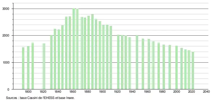 En 2021, la commune comptait 1 394 habitants[Note 4], en diminution de 4,65 % par rapport à 2015 (Cher : −3,05 %, France hors Mayotte : +1,84 %).