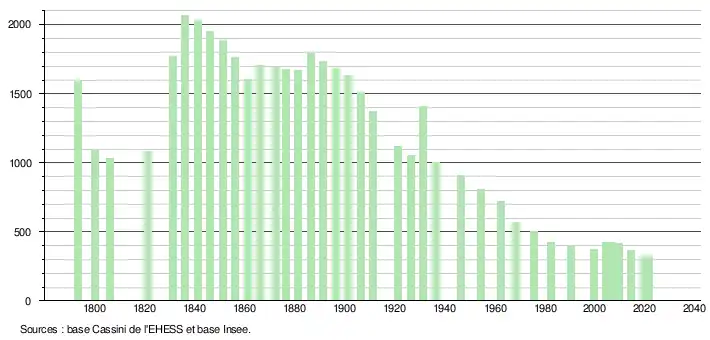 L'évolution du nombre d'habitants est connue à travers les recensements de la population effectués dans la commune depuis 1793. Pour les communes de moins de 10 000 habitants, une enquête de recensement portant sur toute la population est réalisée tous les cinq ans, les populations légales des années intermédiaires étant quant à elles estimées par interpolation ou extrapolation[31]. Pour la commune, le premier recensement exhaustif entrant dans le cadre du nouveau dispositif a été réalisé en 2004[32].