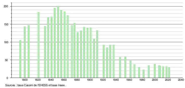 L'évolution du nombre d'habitants est connue à travers les recensements de la population effectués dans la commune depuis 1793. Pour les communes de moins de 10 000 habitants, une enquête de recensement portant sur toute la population est réalisée tous les cinq ans, les populations légales des années intermédiaires étant quant à elles estimées par interpolation ou extrapolation[20]. Pour la commune, le premier recensement exhaustif entrant dans le cadre du nouveau dispositif a été réalisé en 2007[21].