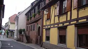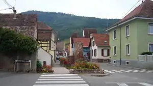 Rue principale de Châtenois. Au loin : château de l'Ortenbourg. | |
