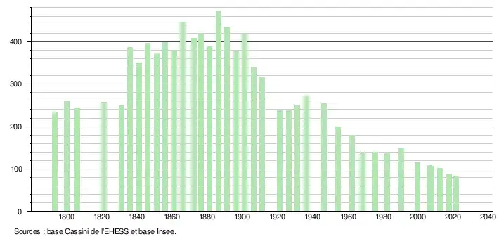 L'évolution du nombre d'habitants est connue à travers les recensements de la population effectués dans la commune depuis 1793. Pour les communes de moins de 10 000 habitants, une enquête de recensement portant sur toute la population est réalisée tous les cinq ans, les populations légales des années intermédiaires étant quant à elles estimées par interpolation ou extrapolation[14]. Pour la commune, le premier recensement exhaustif entrant dans le cadre du nouveau dispositif a été réalisé en 2007[15].