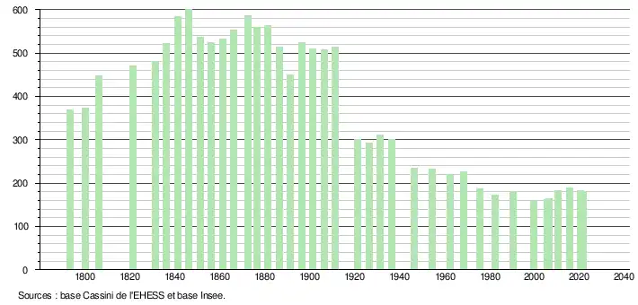 L'évolution du nombre d'habitants est connue à travers les recensements de la population effectués dans la commune depuis 1793. Pour les communes de moins de 10 000 habitants, une enquête de recensement portant sur toute la population est réalisée tous les cinq ans, les populations légales des années intermédiaires étant quant à elles estimées par interpolation ou extrapolation[48]. Pour la commune, le premier recensement exhaustif entrant dans le cadre du nouveau dispositif a été réalisé en 2005[49].