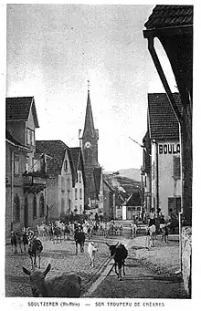 En parallèle, en grande économie agricole la chèvre était adjointe aux troupeaux ovins et bovins en transhumance[9],[10]. En effet l’Alsace et la Lorraine étant des régions de grande transhumance ovine horizontale[11], des chèvres figuraient habituellement dans les troupeaux. La facilité d’apprivoisement des caprins permettait une meilleure conduite des troupeaux (chèvres guides et de rappel). En effet les chèvres recherchant la plus grande variété possible de végétaux, consomment les plantes que les moutons ignorent : bardanes, chardons, orties mûres, arbustes, roseaux, ronces et lierres. Elles se tiennent donc en périphérie du troupeau et l’entraînent. De plus leur capacité à bien marcher est entretenue car les moutons lorrains sont de grande taille et bon marcheurs (anciens Wurtembergeois, actuel moutons de l’Est à laine Mérinos).