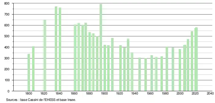 L'évolution du nombre d'habitants est connue à travers les recensements de la population effectués dans la commune depuis 1800. Pour les communes de moins de 10 000 habitants, une enquête de recensement portant sur toute la population est réalisée tous les cinq ans, les populations légales des années intermédiaires étant quant à elles estimées par interpolation ou extrapolation[19]. Pour la commune, le premier recensement exhaustif entrant dans le cadre du nouveau dispositif a été réalisé en 2005[20].