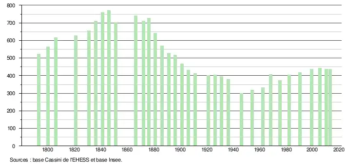 L'évolution du nombre d'habitants est connue à travers les recensements de la population effectués dans la commune depuis 1793. À partir du , les populations légales des communes sont publiées annuellement dans le cadre d'un recensement qui repose désormais sur une collecte d'information annuelle, concernant successivement tous les territoires communaux au cours d'une période de cinq ans. Pour les communes de moins de 10 000 habitants, une enquête de recensement portant sur toute la population est réalisée tous les cinq ans, les populations légales des années intermédiaires étant quant à elles estimées par interpolation ou extrapolation[8]. Pour la commune, le premier recensement exhaustif entrant dans le cadre du nouveau dispositif a été réalisé en 2005[9],[Note 1].